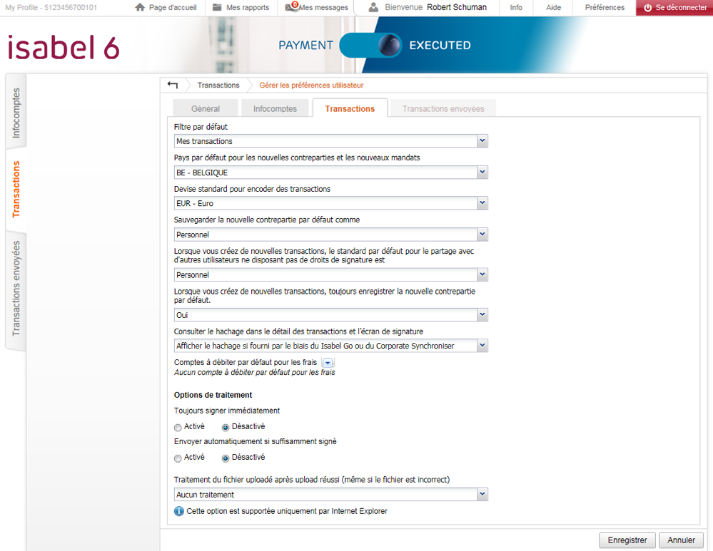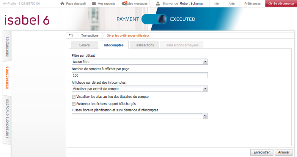- Dossier de démarrage par défaut : choisissez quel onglet doit être ouvert après avoir cliqué sur le logo d'Isabel 6 (infocomptes, Transactions ou Transactions envoyées).