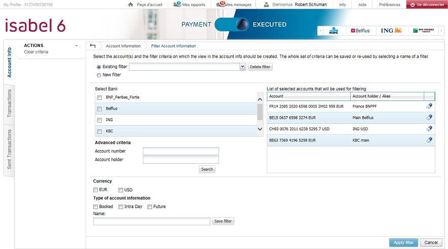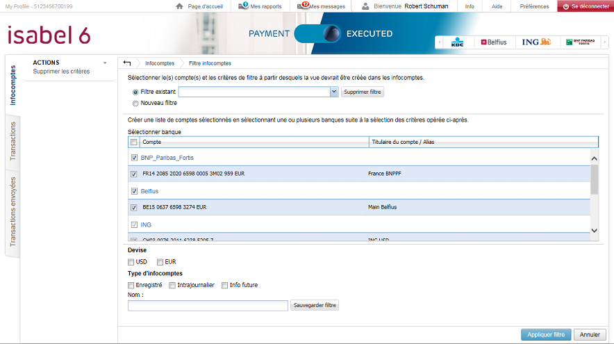 L'utilisation des filtres peut être très utile pour organiser votre espace infocomptes comme vous le désirez. Un compte unique peut être inclus dans plusieurs filtres. Vous pouvez créer vos propres filtres personnalisés.