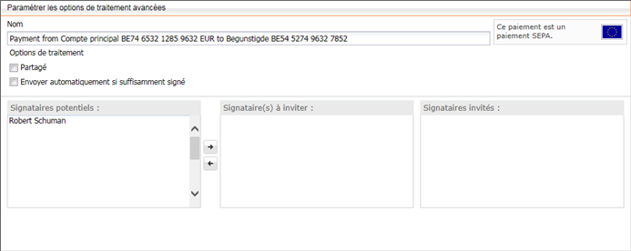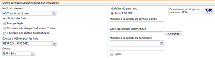Champs NON-SEPA : Lorsque votre paiement est classifié NON-SEPA, des champs supplémentaires s'afficheront lors de la configuration de données de paiements additionelles.
