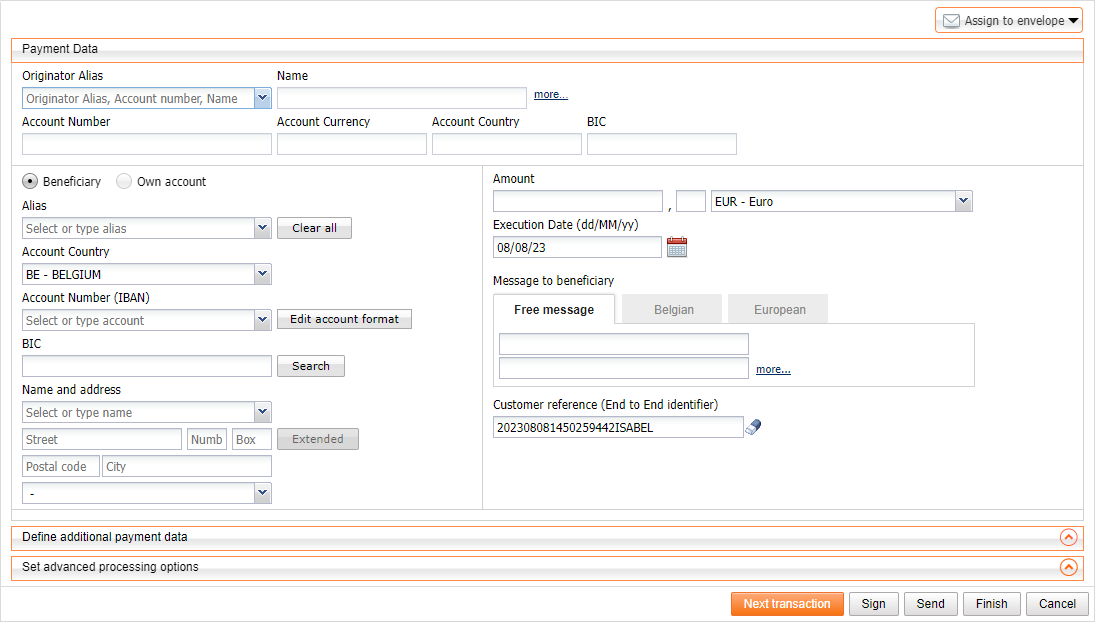 Lorsque vous encodez une transaction dans l'interface, veuillez vous assurer de sélectionner la devise correcte correspondant à la devise du compte bénéficiaire. Après avoir modifié les autres données de paiements sous la section 'Données du paiement', ouvrez la seconde section 'Définir données supplémentaires sur le paiement'. Assurez-vous de sélectionner ici 'Payer la contre-valeur de...' sous l'option 'Modalités de paiement'. Vous pourrez alors signer et envoyer le paiement.
