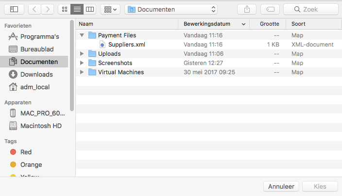 - Er zal een navigator (type Finder) verschijnen om het u gemakkelijk te maken om naar de map te navigeren waar uw bankbestanden zich bevinden. Selecteer daar de bestanden die u wenst te uploaden en klik op Kies.