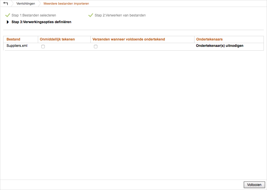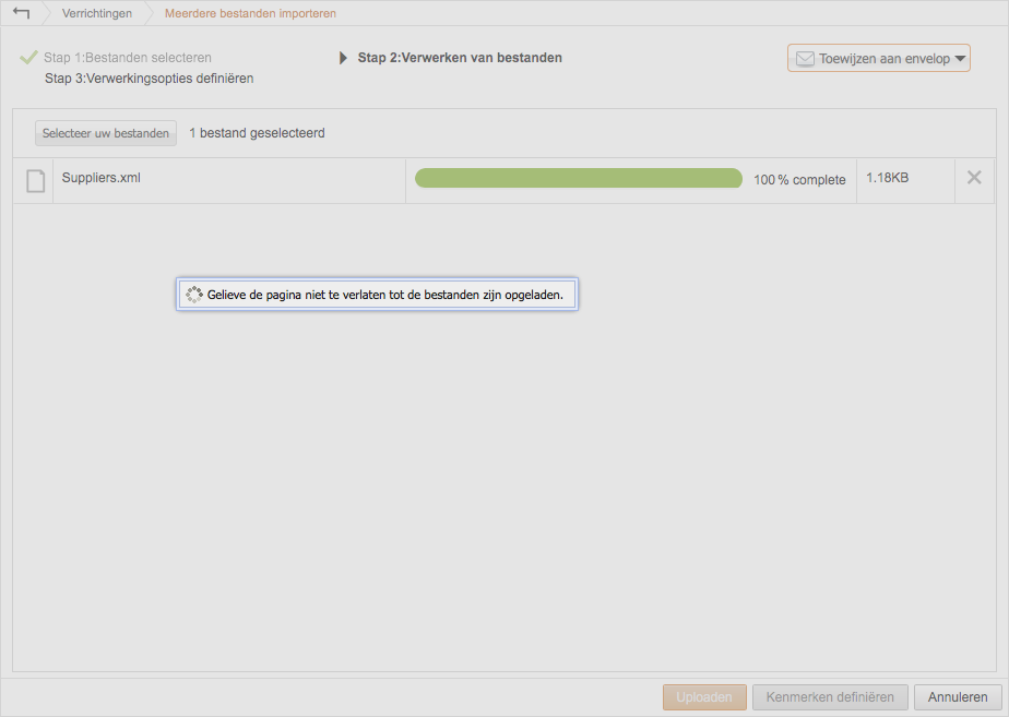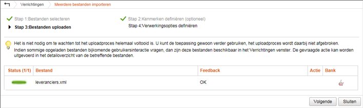 Eenmaal het uploadproces is voltooid, worden de bestanden verwerkt. Dit proces kan enige tijd in beslag nemen, afhankelijk van het aantal transacties en de complexiteit van de geconfigureerde tekenrechten.