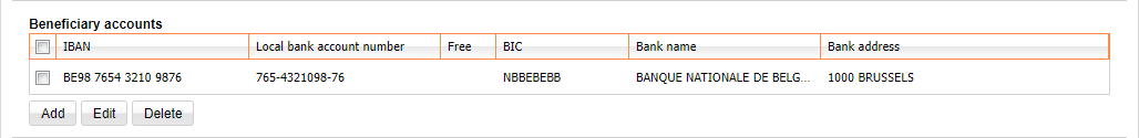 - In de details van de tegenpartij, klik op een bestaande begunstigde rekening of klik op de Toevoegen knop.