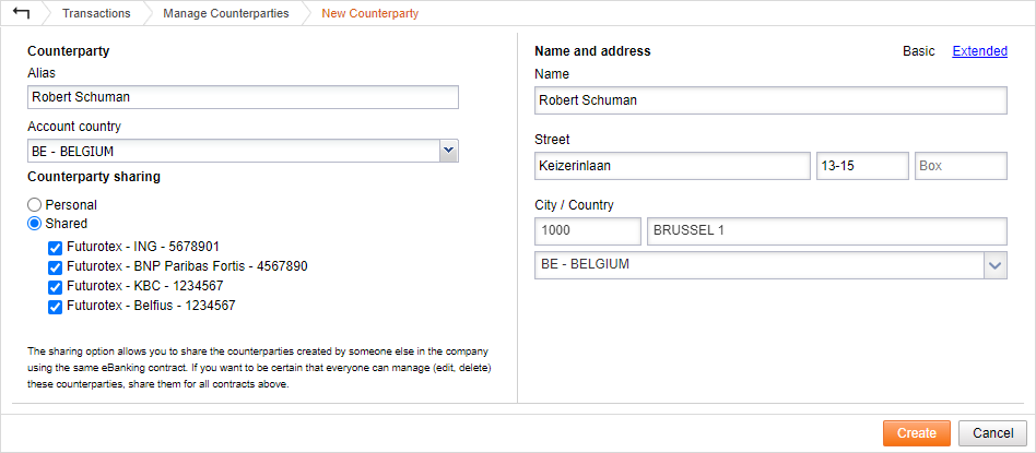 Tegenpartijen delen laat u toe om uw tegenpartijen beschikbaar te maken voor alle personen waar u via een ebanking contract mee verbonden bent. Wanneer u deelt, zijn andere personen in staat betalingen aan te maken aan de hand van uw gedeelde tegenpartijen.