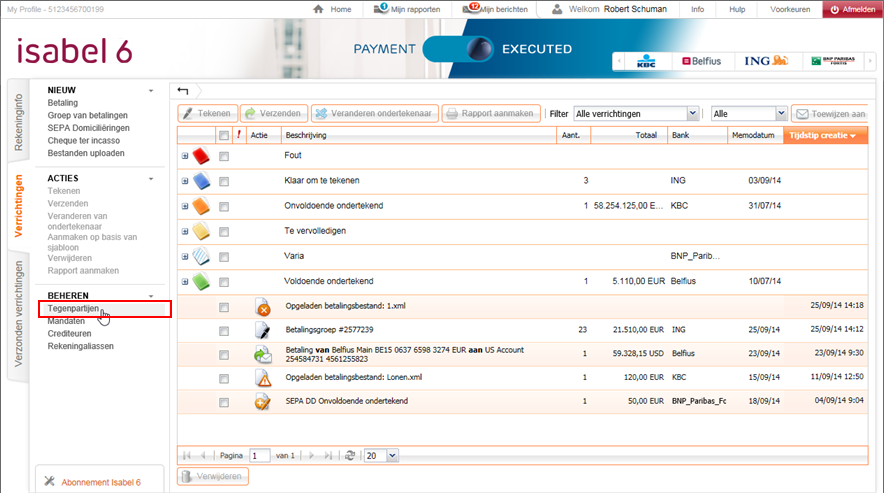 gebruiker verwijdert uit uw Isabel abonnement, dan dient een andere gebruiker uit hetzelfde contract zich in te schrijven op MultiSign. Tot dan kunt u geen aanpassingen meer uitvoeren aan uw tegenpartijen. - Persoonlijke tegenpartijen worden verwijderd na enkele maanden. Het wordt daarom aangeraden om, indien nodig, eerst de persoonlijke tegenpartijen over te zetten naar een andere gebruiker alvorens de gebruiker te verwijderen.