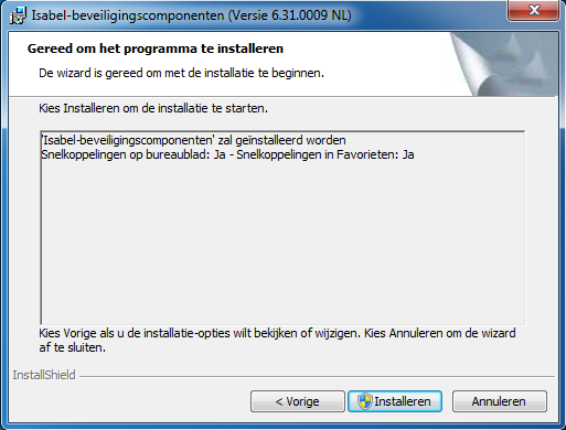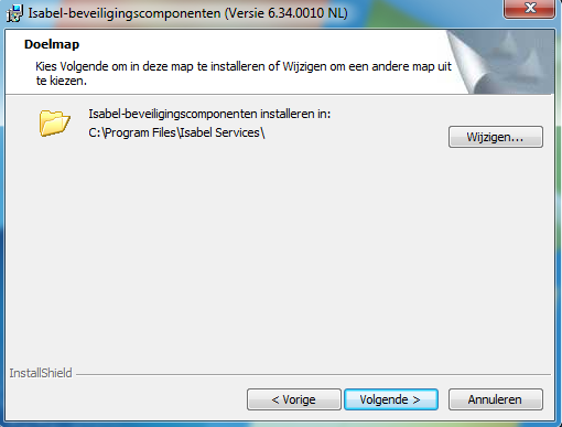 De standaard doelmap voor de installatie van de Isabel-beveiligingscomponenten zal worden voorgesteld. Indien nodig kan deze worden aangepast (enkel aangeraden voor geavanceerde gebruikers).